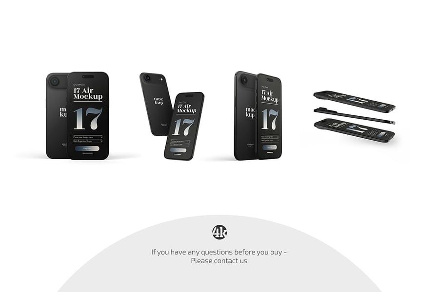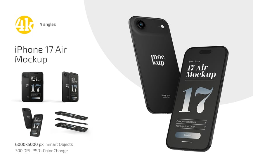 使用 iPhone 17 Air 模型套装,打造惊艳的演示文稿。我们的模型采用高分辨率制作,完美展示您的徽标、品牌标识等。智能对象功能还能节省大量时间。只需点击智能对象几次,添加您自己的图形,然后保存即可。一切都如此简单!希望您喜欢。
