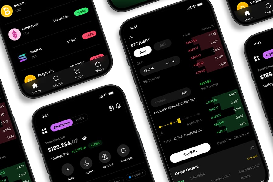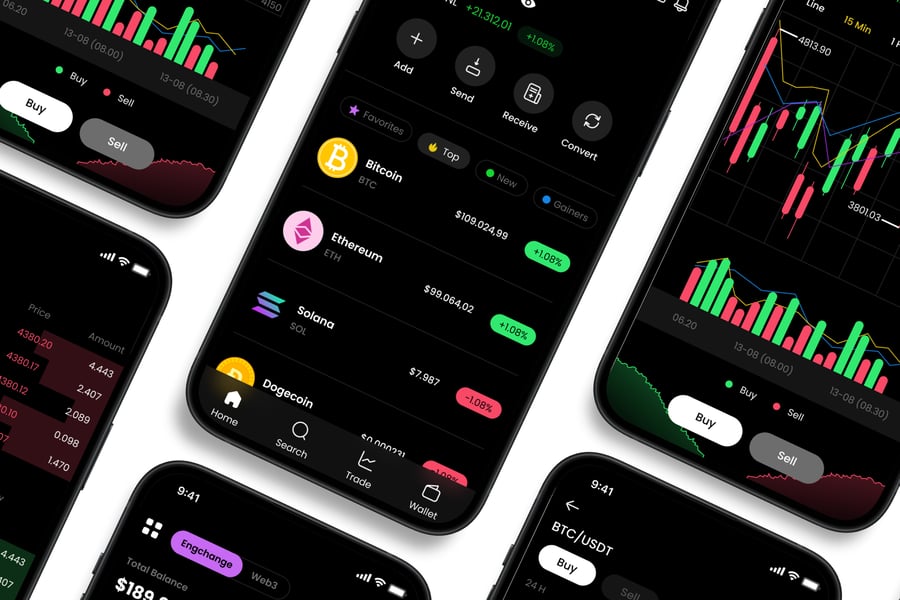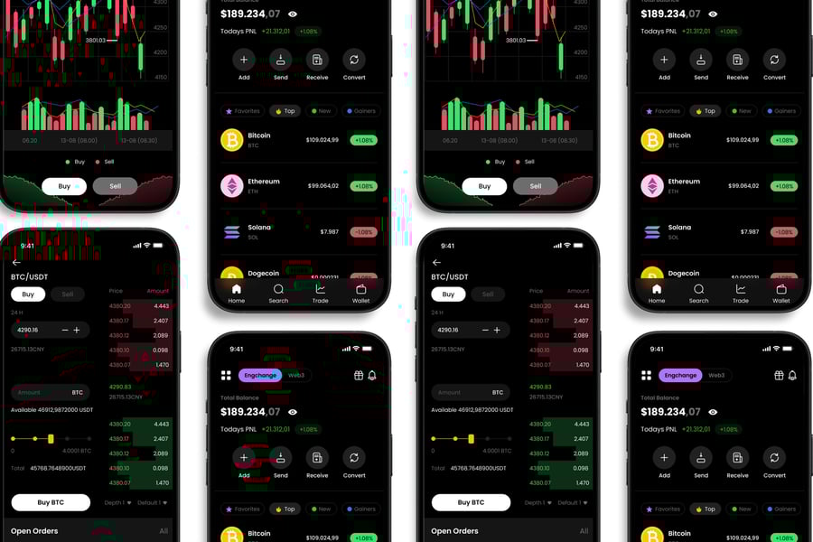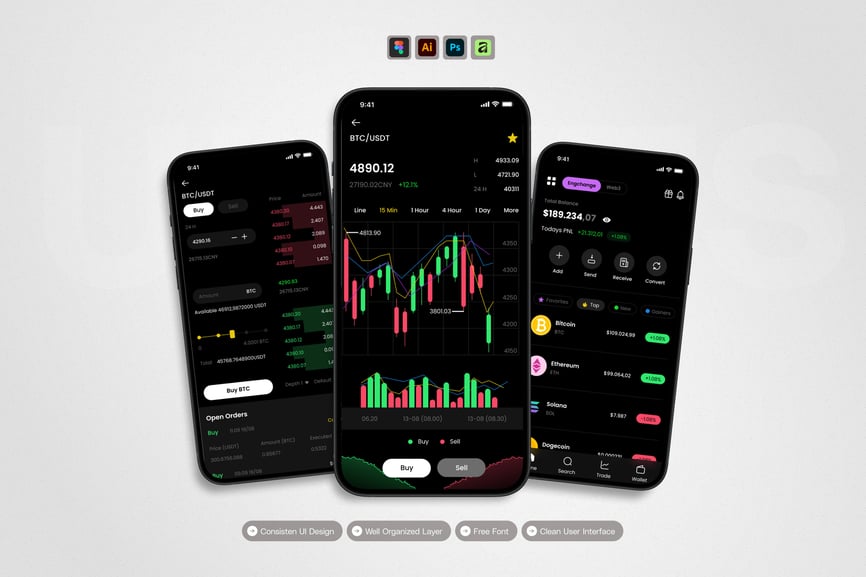 隆重推出 **Crypto** 移动应用 UI 套件,这是一款现代化且功能全面的解决方案,可助您创建简洁易用的应用界面。对于希望加快设计流程的设计师和开发者而言,这款 UI 套件堪称完美之选,它将您所需的所有基本组件整合在一个井然有序的软件包中。