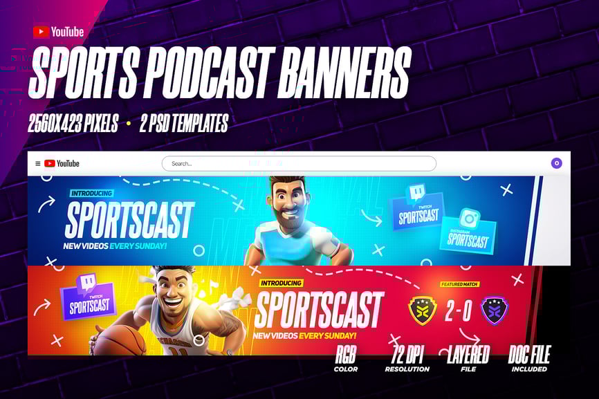 体育播客 YouTube 横幅广告 RS / 2025年12月4日 Ui Kits 12 0 0 **产品概述** * 2 个 PSD 文件 * 2560×423 像素 * 不包含照片 * 字体链接在 README 文件中