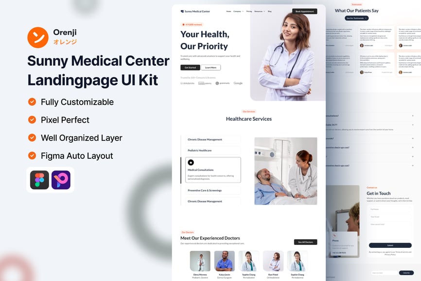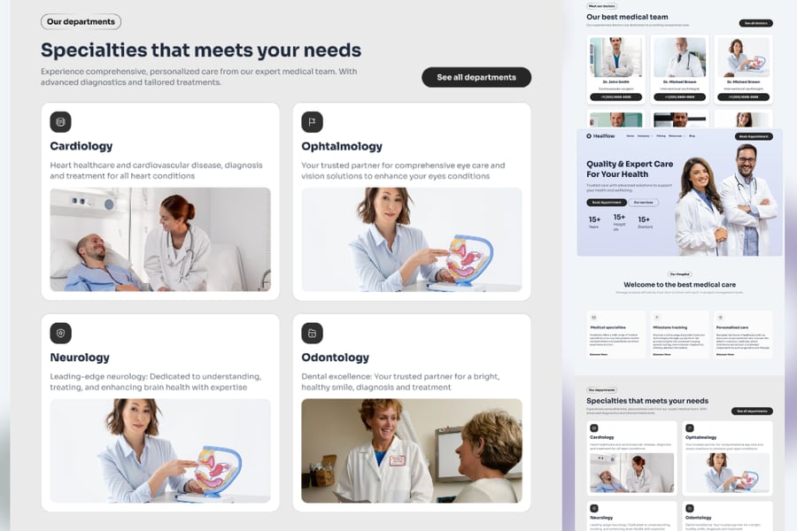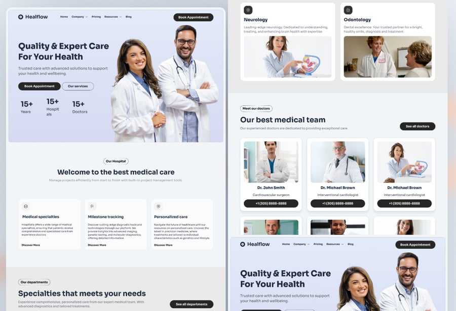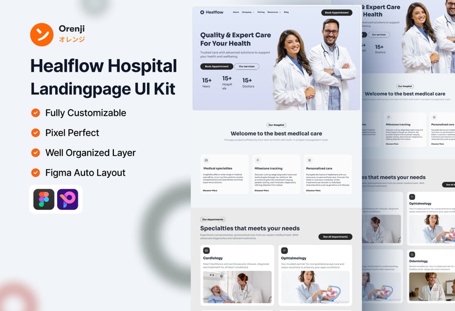 Healflow 医院登录页面 UI 套件,用于构建医疗网站。这些组件基于矢量图形,完全兼容,可编辑,并且像素级精准。此外,它们组织良好,命名清晰,分组合理。使用的字体为 Google 免费字体。