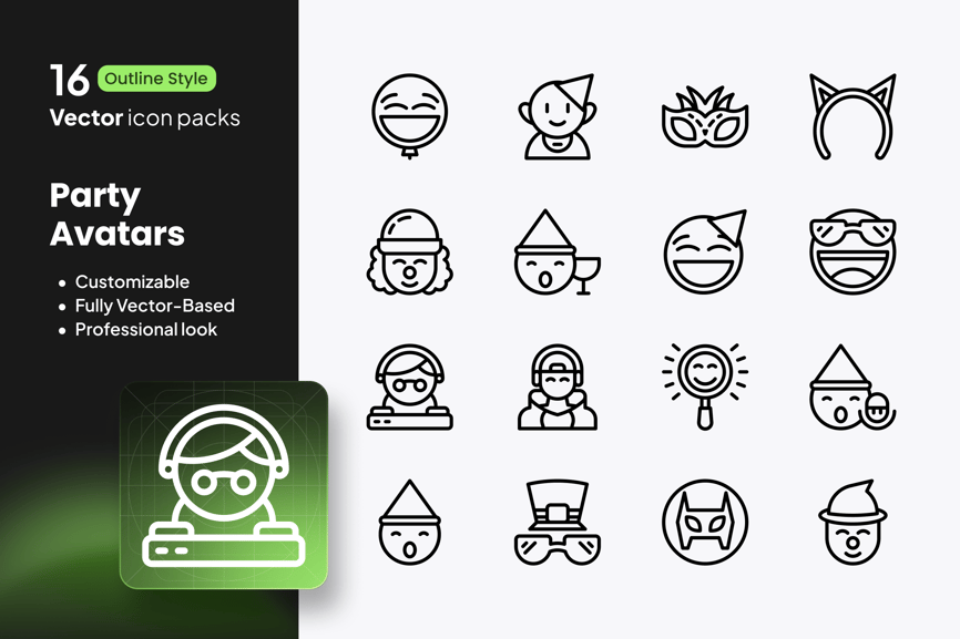 用这套包含 16 个简洁轮廓风格矢量图标的派对头像图标集,打造时尚的庆祝活动。该系列图标以喜庆的人物形象为特色,他们头戴派对帽,手持气球,手持饮料、乐器,身着礼品,并带有各种庆祝符号——非常适合用于活动品牌推广、邀请函、社交媒体平台、生活方式博客或娱乐项目。