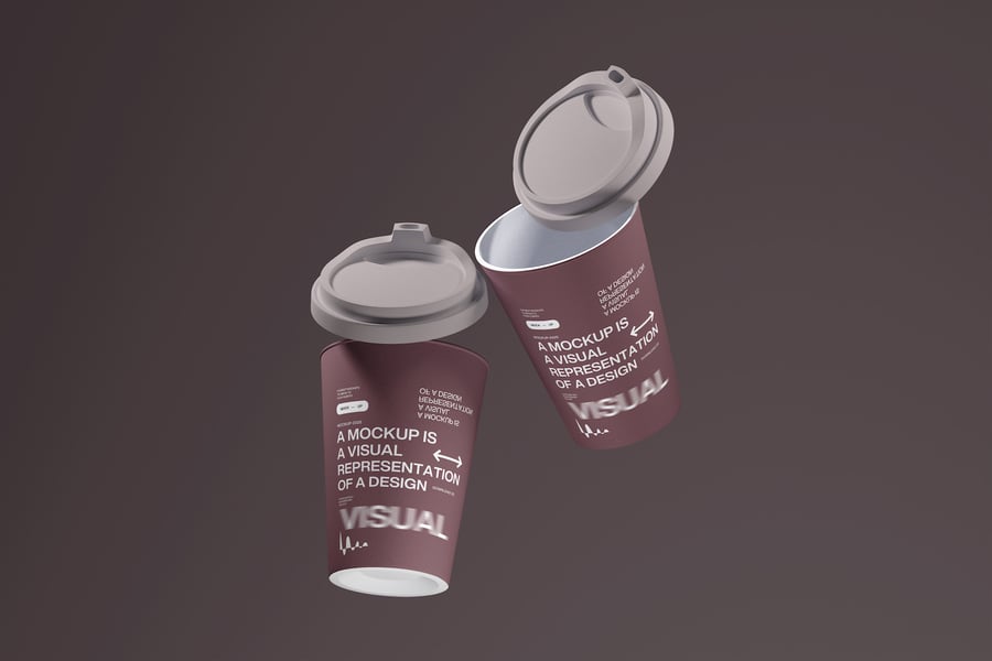 一套精细的纸质咖啡杯(带盖)模型,非常适合用于展示咖啡馆品牌、饮料包装和标志设计。此模板清晰地展示了杯身和杯盖结构,可实现有效的视觉呈现