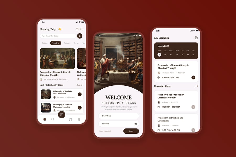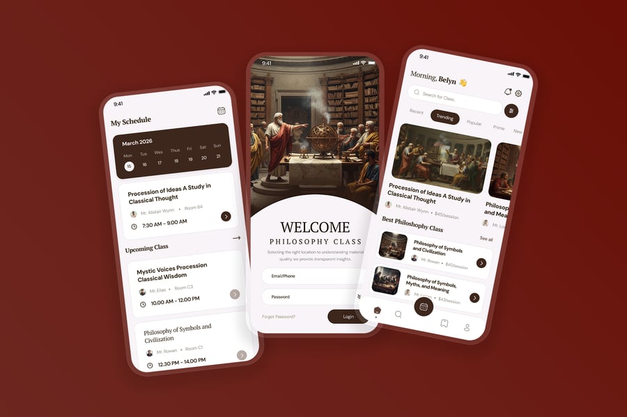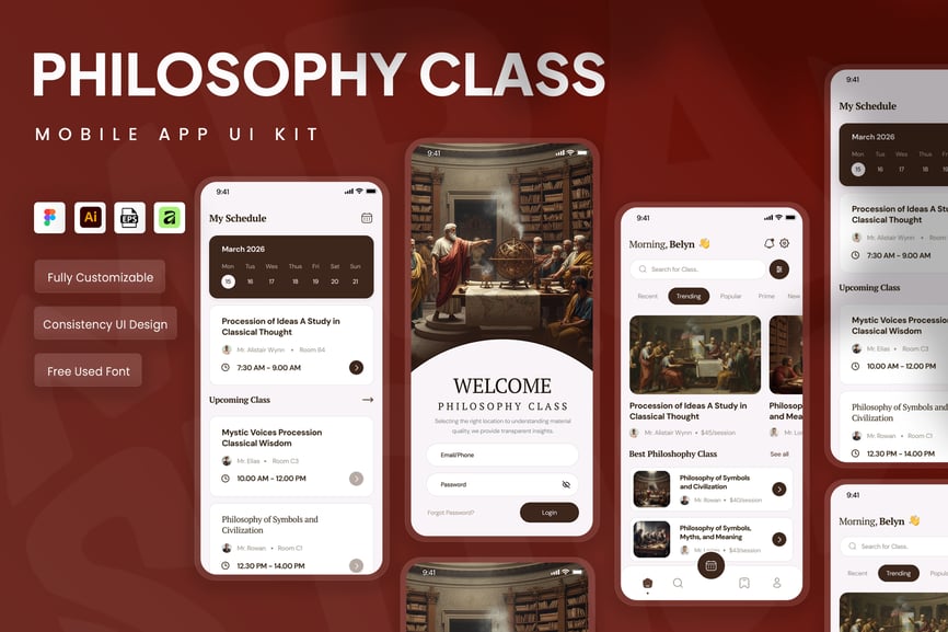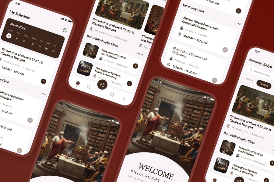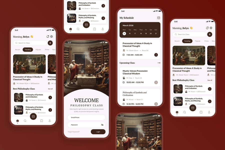 这款现代化的哲学课堂移动应用UI套件旨在提升学习体验,其简洁、周到且结构化的界面专为教育平台而设计。该套件采用柔和的中性色调、极简的布局和清晰的字体,旨在营造专注的学习氛围,帮助用户深入理解哲学概念和理论。