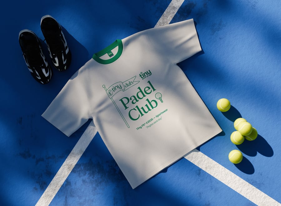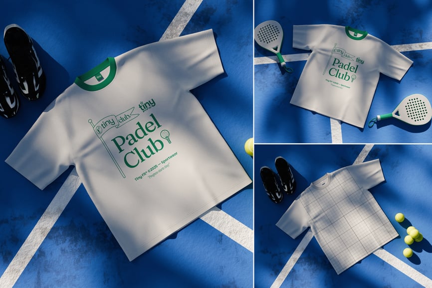 用这款**俯视视角T恤样机**捕捉比赛日的氛围。一件T恤平铺在**亮蓝色板式网球场**上,周围环绕着球拍、球鞋和网球。强烈的顶灯营造出鲜明的阴影和高对比度——完美展现运动街头服饰、活力系列或充满动感的板式网球周边产品。