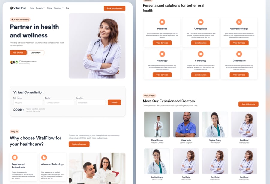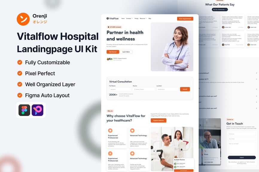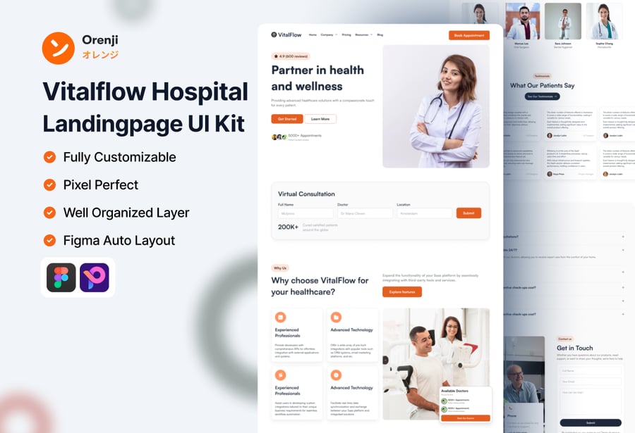 Vitalflow 医院登录页面 UI 套件,用于构建医疗网站。这些组件基于矢量图形,完全兼容,可编辑,并且像素级精准。此外,它们组织良好,命名清晰,分组合理。使用的字体为 Google 免费字体。