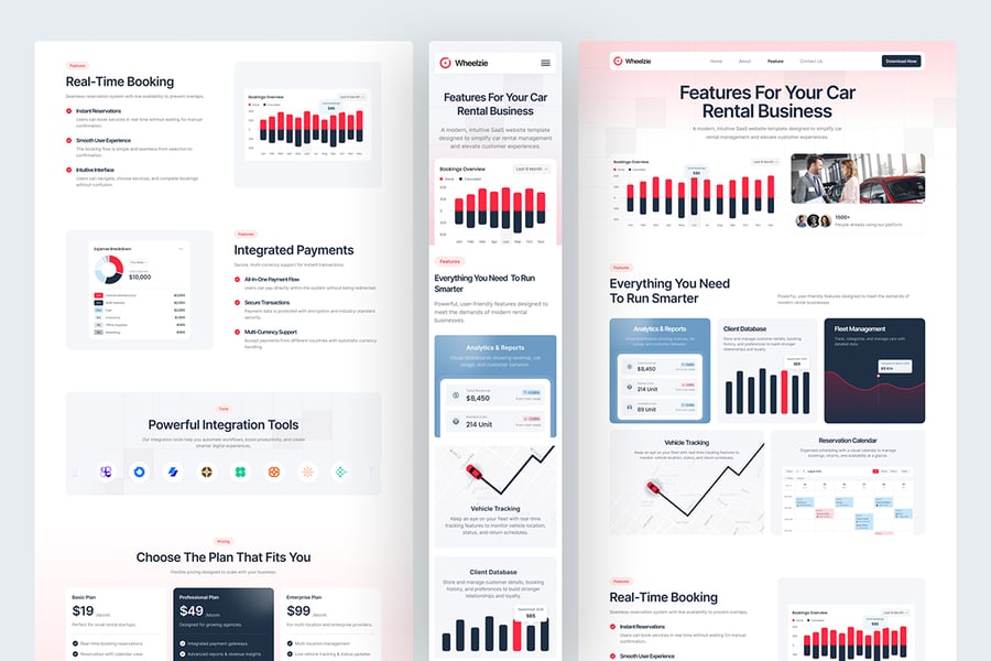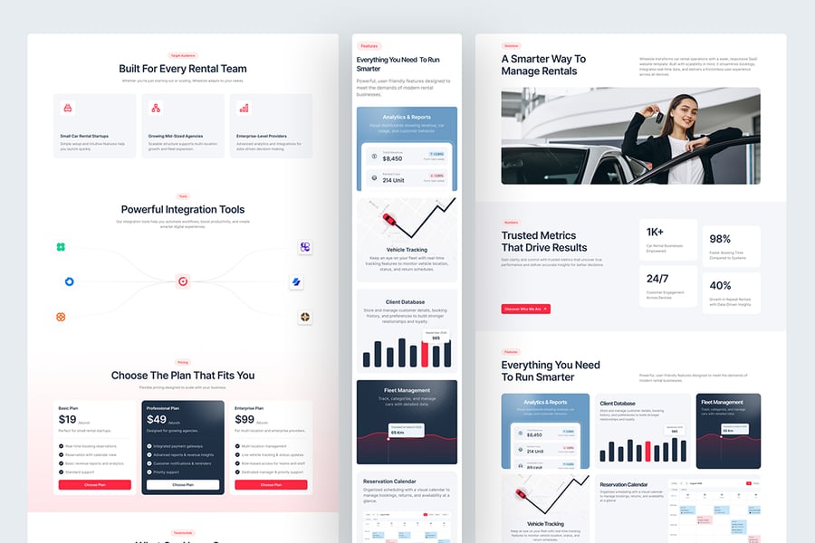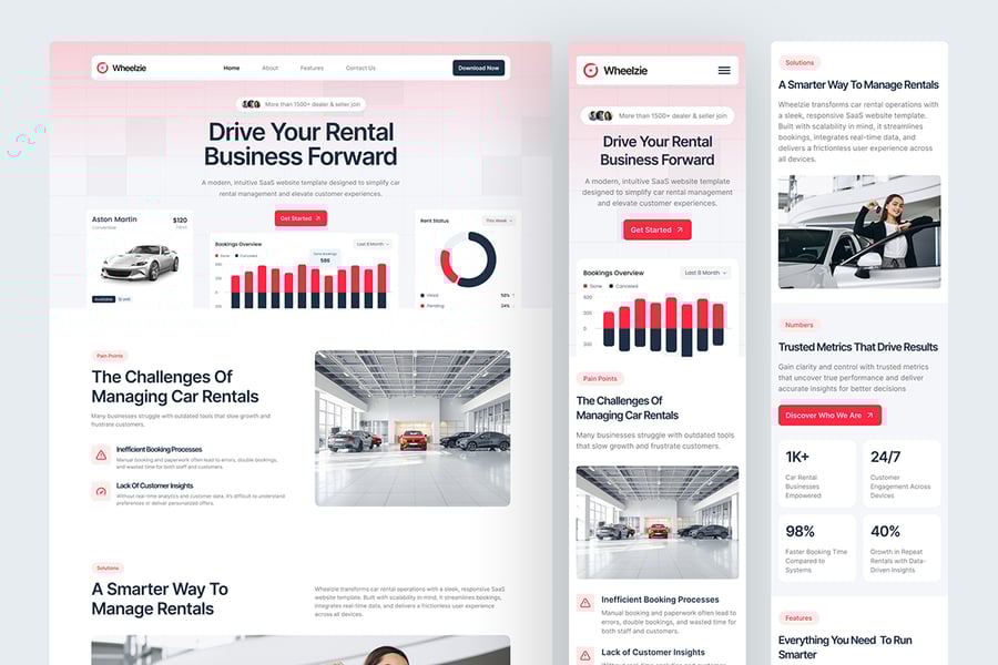 每个页面都经过精心设计,旨在传达可靠性:从实时预订可视化和性能指标到全球运营、客户案例和清晰的服务说明。无论您是展示 SaaS 平台、创建租赁服务 MVP,还是构建仪表盘配套网站,Wheelzie 都能为您提供完美的平台,助您展现创新、专业和流畅的租赁运营。