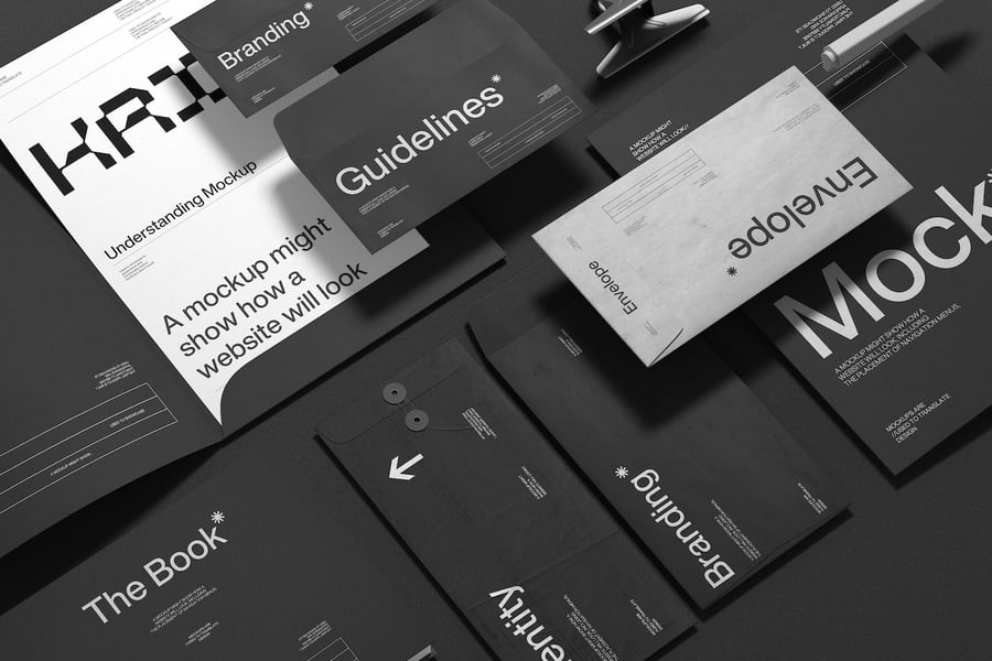 一套完整的文具样机,包含信封、文件夹、文档和品牌元素,用于展示品牌标识设计。此布局提供了清晰的展示空间,可用于呈现徽标、字体和视觉指南