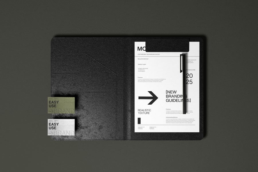 一款简洁的文具样机,包含文件夹、文件、卡片和笔的摆放,专为展示品牌形象和企业资料而设计。适用于展示标志系统、版式设计和专业品牌指南。