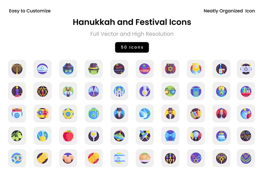 这套图标包包含与犹太教、光明节、以色列、象征符号、食物和节日相关的各种符号。非常适合用于仪表盘、用户界面工具包、移动应用、网页设计、演示文稿、营销视觉素材和信息图表。