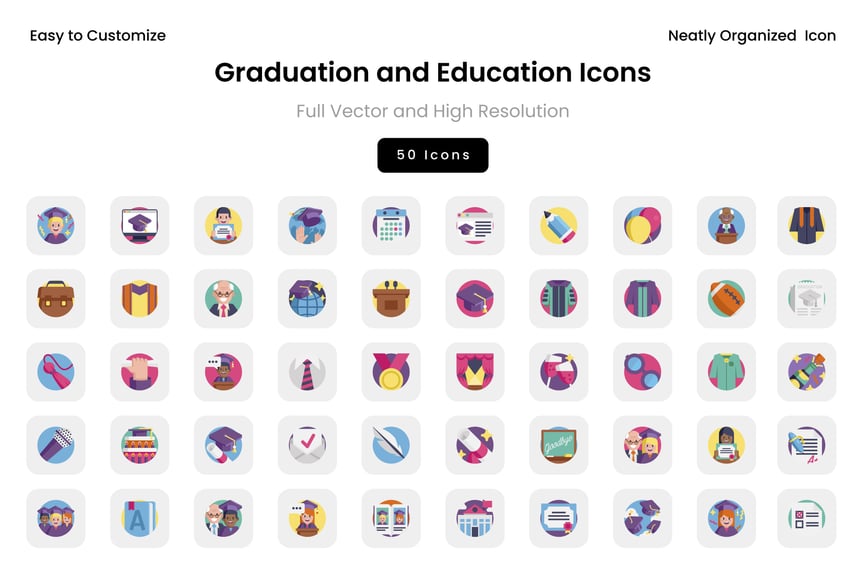 这套图标包包含与教育、庆祝、毕业、学术界、沟通和成就相关的各种符号。非常适合用于仪表盘、用户界面工具包、移动应用、网页设计、演示文稿、营销视觉素材和信息图表。