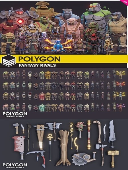 低多边形资产包的角色,武器,道具和FX资产,以创建一个幻想多边形风格的游戏。包括一个新的大型怪物的大钻机