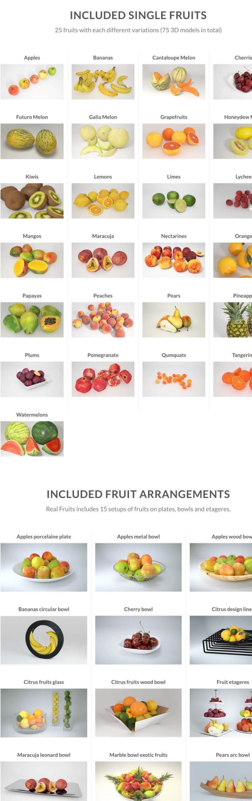 真实水果是一组高度逼真的水果模型和碗,用于在建筑中做广告或装饰。捆绑包包括从25种选择的水果,异国水果,柑橘类水果和甜瓜中选择的90多种3d模型,以及放在碗和盘子中的15种水果安排,可以随时放入场景中。通过使用多角度照片作为建模和纹理的来源,所有模型都是从真实的果实中创建的。