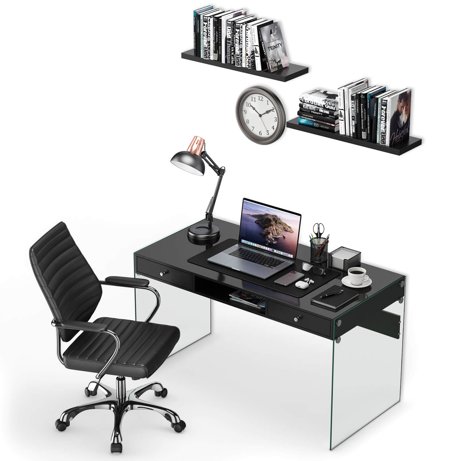 包含Macbook Pro和台灯咖啡文具手机等在内的工作场景办公桌椅3D模型(OBJ,MAX)
