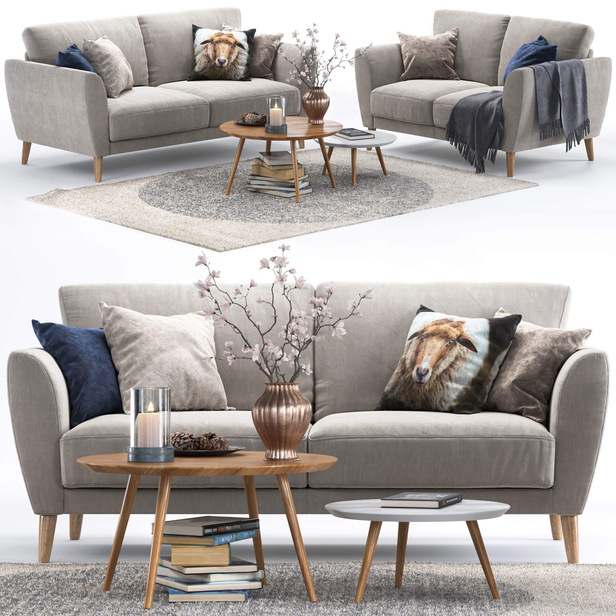 Pohjanmaan Aria双人布艺沙发和茶几 花束 书籍 地毯等组合3D模型(OBJ,MAX)