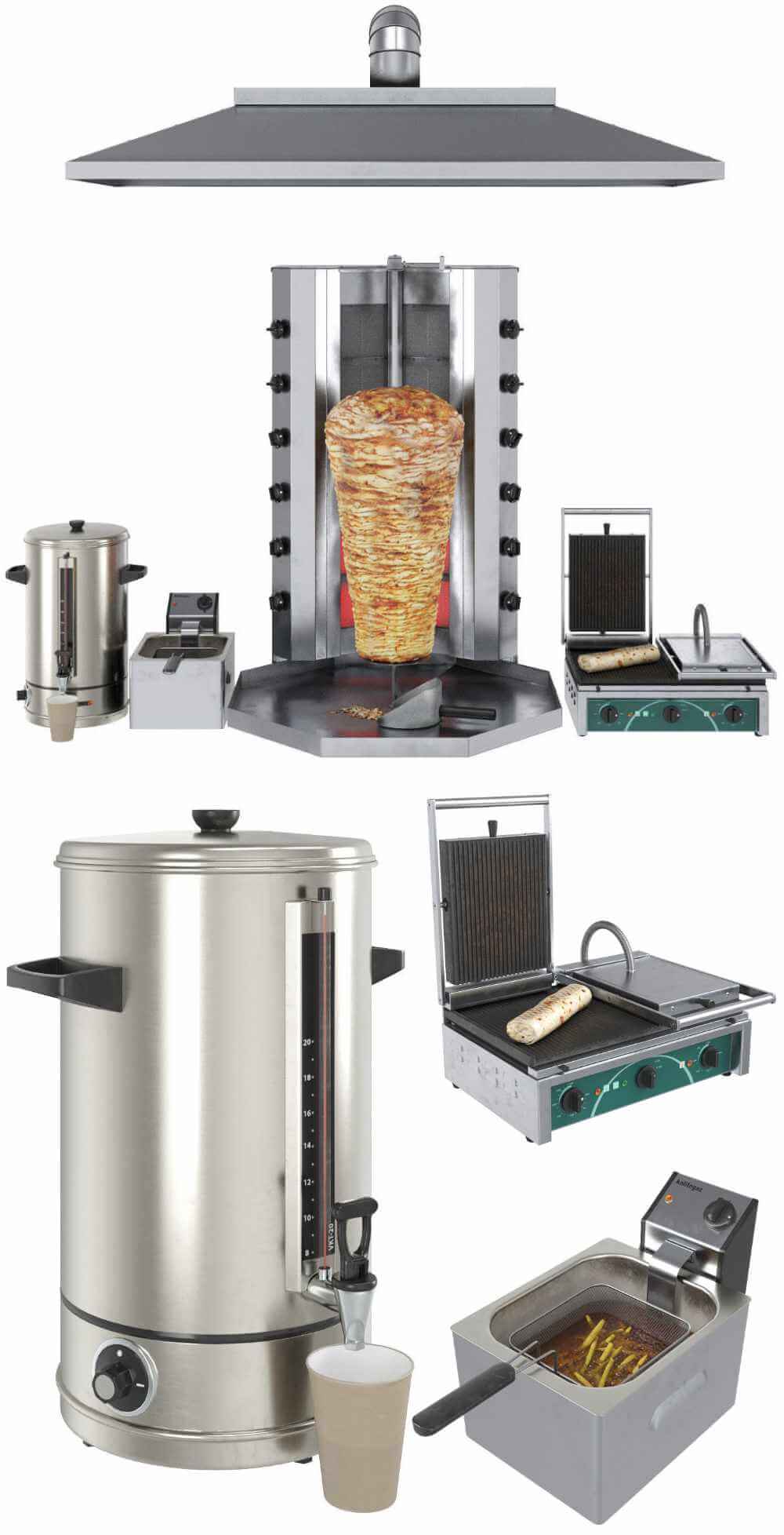 包含Shawarma机 烤架 油烟机 炸锅和热水壶的Shawarma店厨房设备3D模型(FBX,MAX)