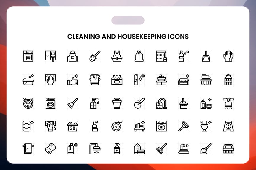此合集汇集了一系列精选图标,主题涵盖家居、清洁、收纳、居家和维护。它们尤其适用于仪表盘、用户界面工具包、移动界面、网站、演示文稿、报告和营销材料。