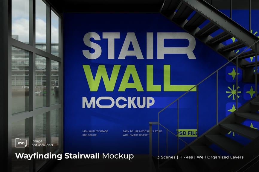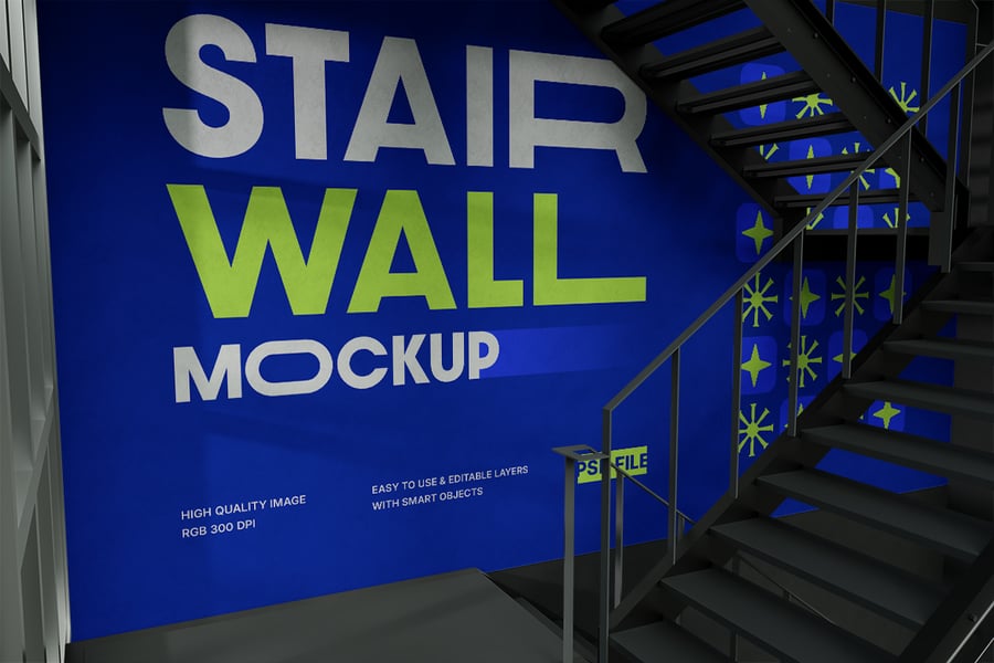 这款**楼梯墙样机**能将您的楼梯墙打造成引人注目的品牌展示空间。样机采用现代室内设计,配有落地窗和工业风金属楼梯。巨大的墙面空间非常适合展示导视系统图形、环境品牌标识、活动宣传或壁画设计,并可搭配鲜艳的色彩和逼真的光照效果。只需使用智能对象替换您的设计稿,即可快速获得极具冲击力的视觉效果,用于客户提案、演示或作品集展示。