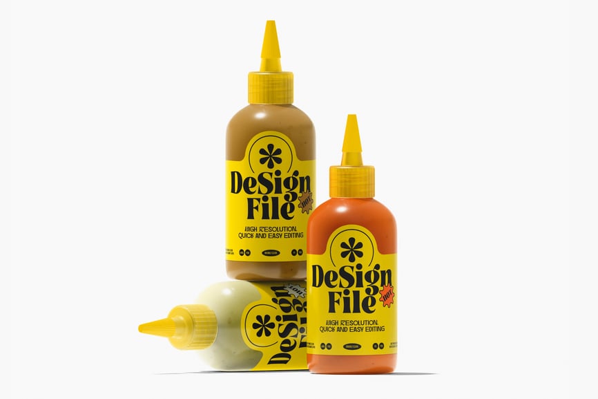 **酱料瓶模型** – 分层、可编辑的 .psd 文件,可通过编辑智能对象和颜色图层来展示您的自定义设计。