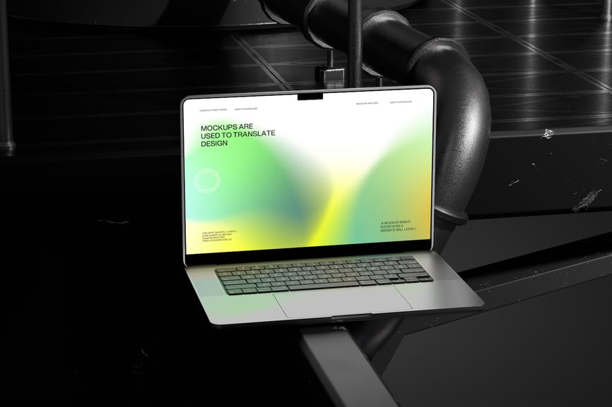 这款模型将笔记本电脑放置在工业风格的平面上,为展示用户界面设计、网页布局或数字品牌形象提供了一个清晰现代的环境。倾斜的视角突出了屏幕内容和整体视觉构图。