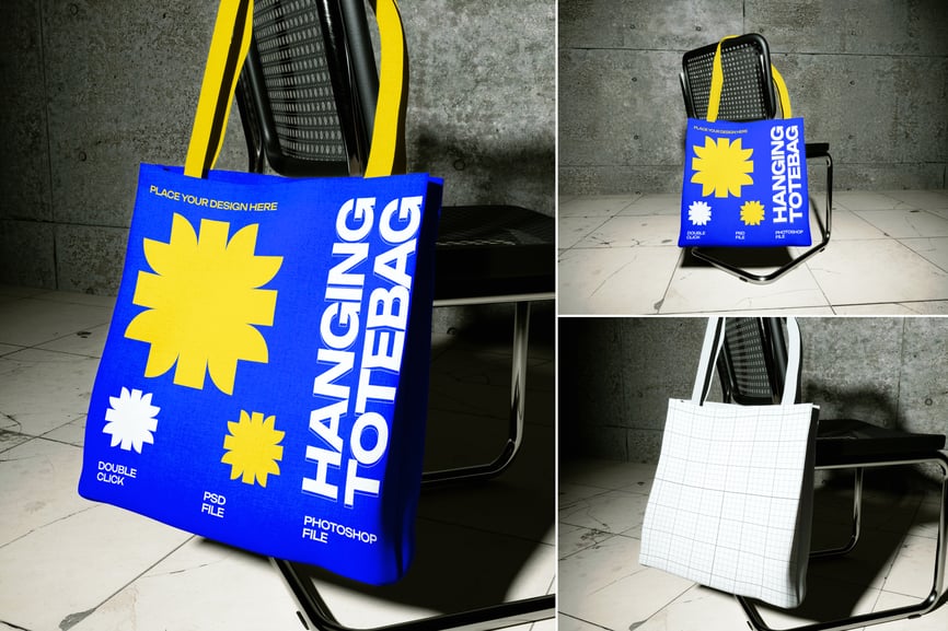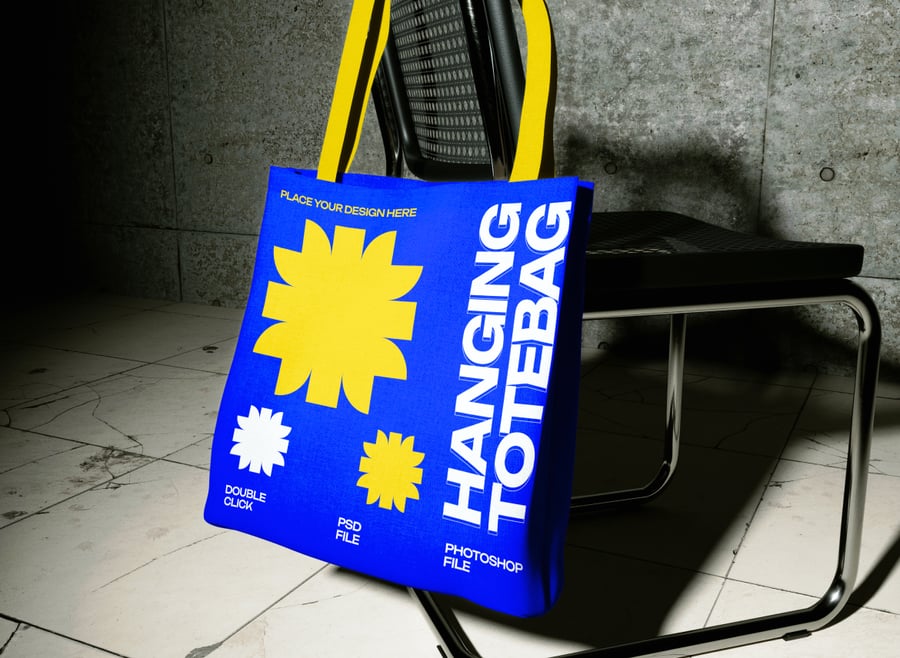 使用这款**逼真的帆布手提袋样机**展示您的设计。一个手提袋**正面朝外,与视线齐平**,置于充满工业风的室内环境中——**裸露的灰色混凝土墙**、**纹理丰富的白色大理石地板**,以及一把置于柔和阴影中的时尚办公椅。柔和的摄影棚灯光和微妙的反射营造出现代高端的氛围——完美适用于高端商品、企业礼品或追求低调精致的生活方式品牌。