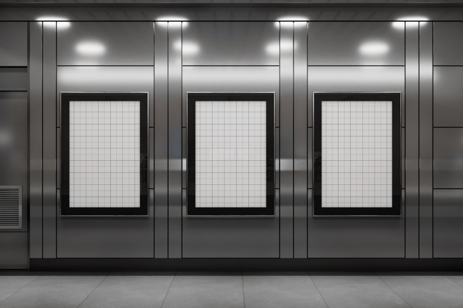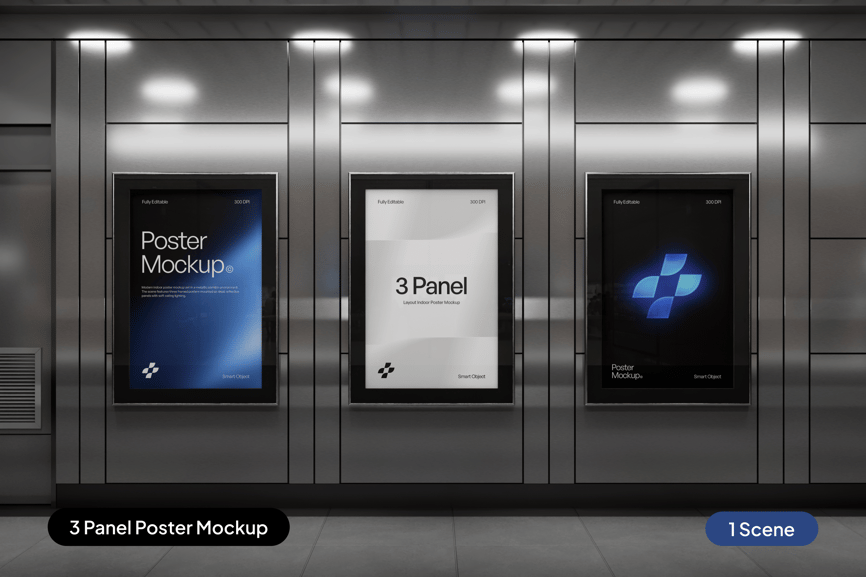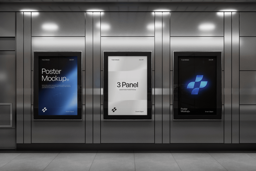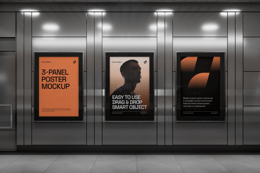 这款高品质、高分辨率且完全可定制的**三联室内海报样机**,让您的创意作品栩栩如生。场景设计于现代走廊环境中,采用光滑的金属背景,柔和的反射光和可控的顶灯营造出逼真的氛围,是专业演示和精美设计预览的理想之选。