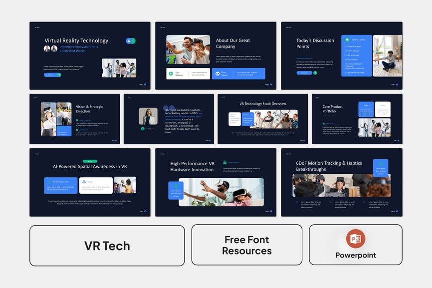 下载 VR 技术演示文稿,自信地展示您的愿景,激发好奇心,并有力地展示您的虚拟现实创新成果。