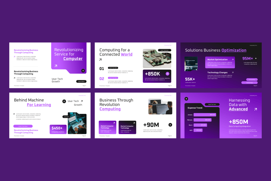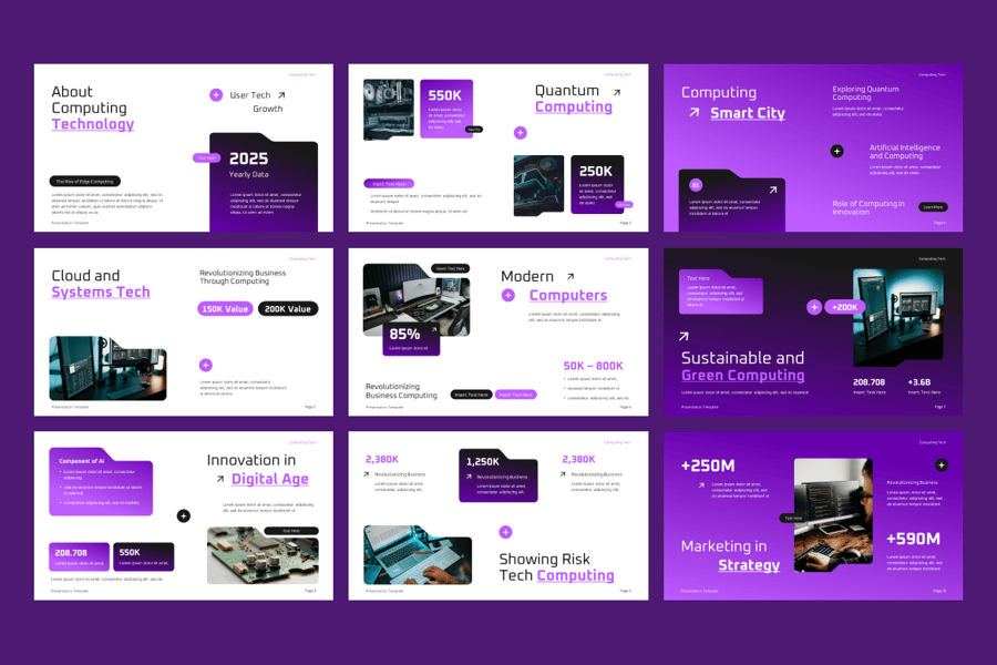 使用这款“计算机技术”Google幻灯片演示模板,让您的下一次演示焕然一新。这款现代专业的模板专为科技、计算机、IT服务、数据分析和软件初创公司量身打造。简洁而充满未来感的模板,助您清晰有力地呈现复杂的技术概念。其精美的布局、信息图表和视觉效果,让您的信息脱颖而出。