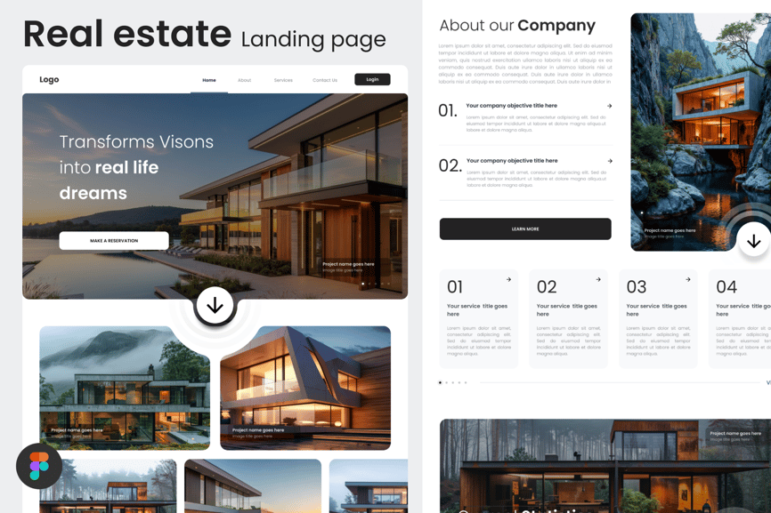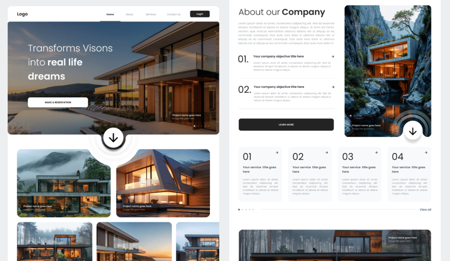 这是一个现代化的高端落地页,专为房地产中介、房地产开发商、建筑事务所、租赁服务公司和投资公司设计。页面布局简洁美观,字体醒目,并配以精美的建筑图片,旨在打造专业可靠的线上形象,有效将访客转化为客户。