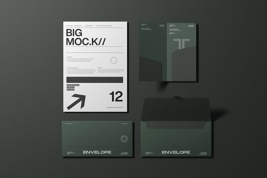 一套包含信纸和多种信封布局的文具样机,非常适合用于展示品牌、识别系统和企业宣传设计。该布局清晰地展示了印刷区域,便于专业演示