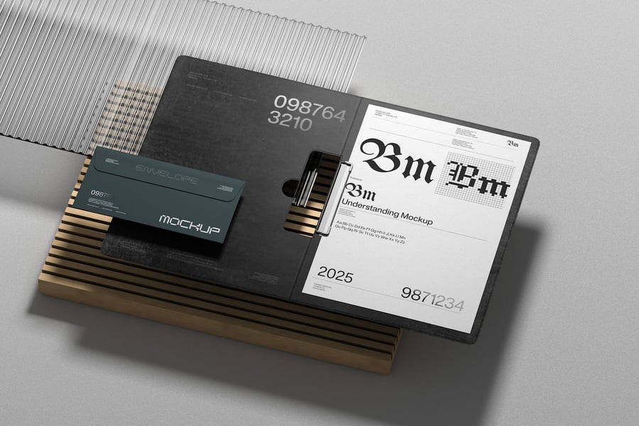 一个专业的样机场景,包含信纸和信封的排列,非常适合展示企业形象和品牌宣传材料。该布局提供了清晰的细节和结构,便于展示可直接用于印刷的设计。