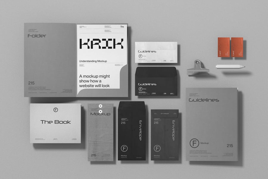 一套全面的文具样机合集,包含文件夹、信封、信纸、名片和配件,用于展示品牌识别系统。布局清晰,每件物品一目了然,非常适合展示统一的品牌设计