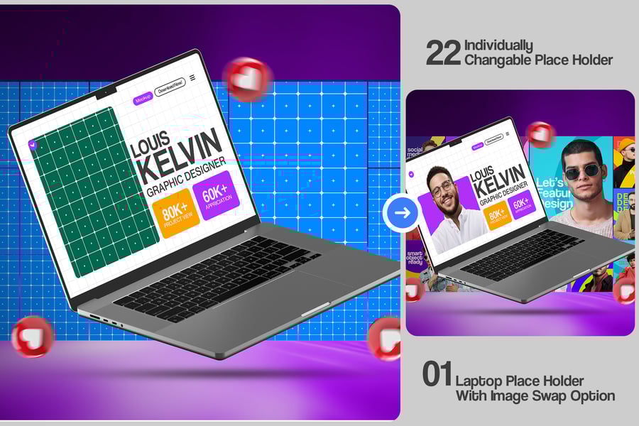 我们使用 Photoshop 的智能对象功能,使这些模型文件易于编辑。您可以轻松替换设计和背景颜色,在几秒钟内创建您想要的效果。这些文件高度可定制,因此您可以创建各种不同的外观。只需按照用户指南(PDF)操作即可。