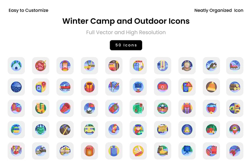 这套图标包包含与冬季、露营、运动、导航、紧急情况和户外活动相关的各种符号。非常适合用于仪表盘、用户界面工具包、移动应用、网页设计、演示文稿、营销视觉素材和信息图表。