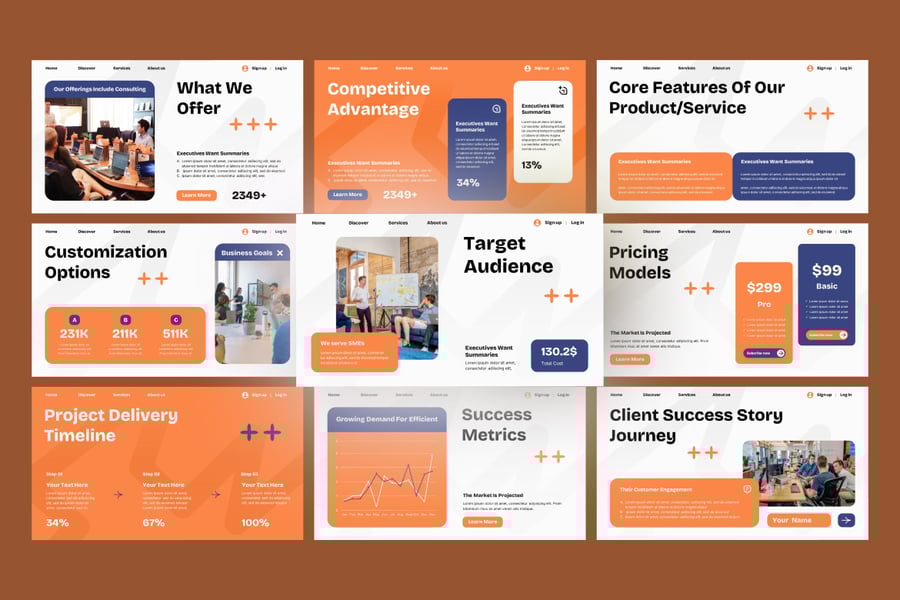 它包含专业设计的幻灯片,采用现代布局、引人入胜的视觉效果和可编辑图表,增强了故事叙述和数据可视化效果。此模板可完全自定义,适用于任何行业,助您打造引人注目、效果显著的制胜方案。适用于商业产品介绍、服务演示、商业提案、公司产品介绍、服务介绍、商业推介、企业演示等。