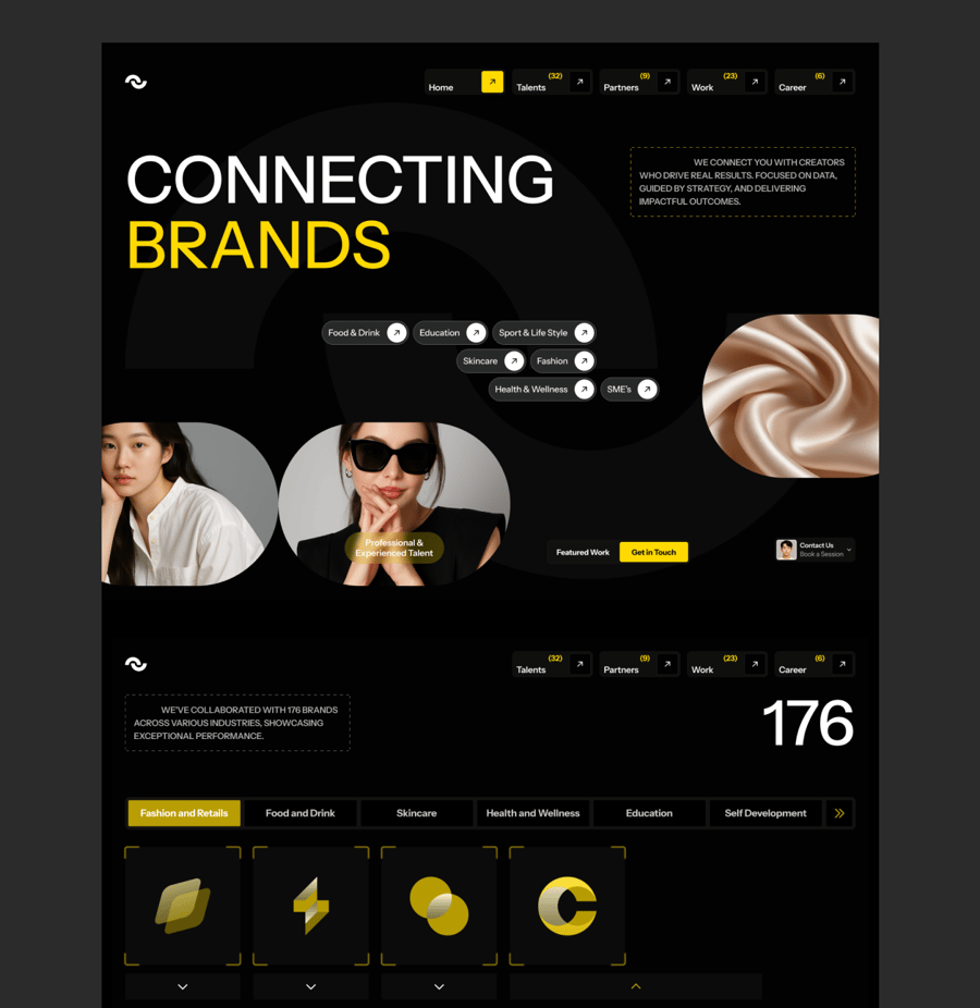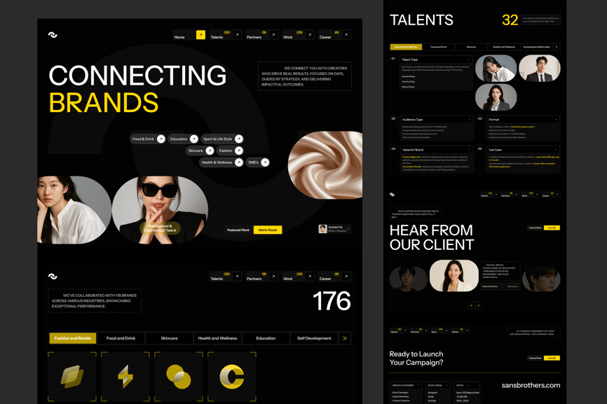 Groebest 是一款管理网站落地页 UI 套件。落地页包含 6 个部分,分别是:首页、品牌与合作伙伴、人才、推荐、行动号召 (CTA) 和页脚。