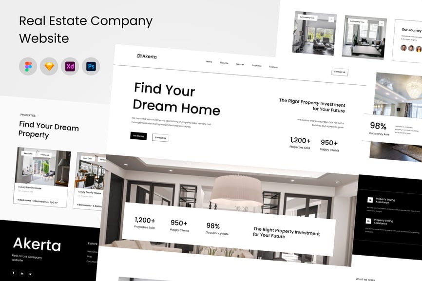 ***Akerta – 房地产公司网站***,包含 4 个文件。易于自定义、编辑和缩放。布局整齐,注重细节。