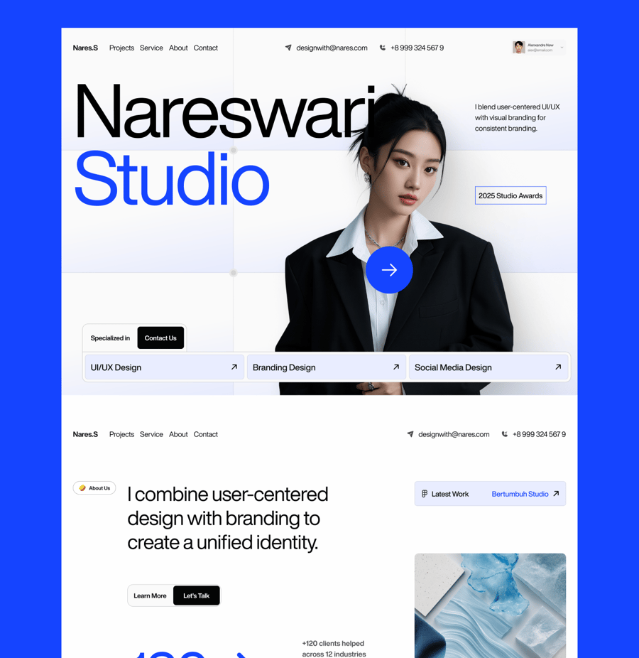 Nares.S 是一款个人网站落地页 UI 套件。落地页包含 6 个部分:首页、关于我们、最新作品、我们的服务、行动号召 (CTA) 和页脚。