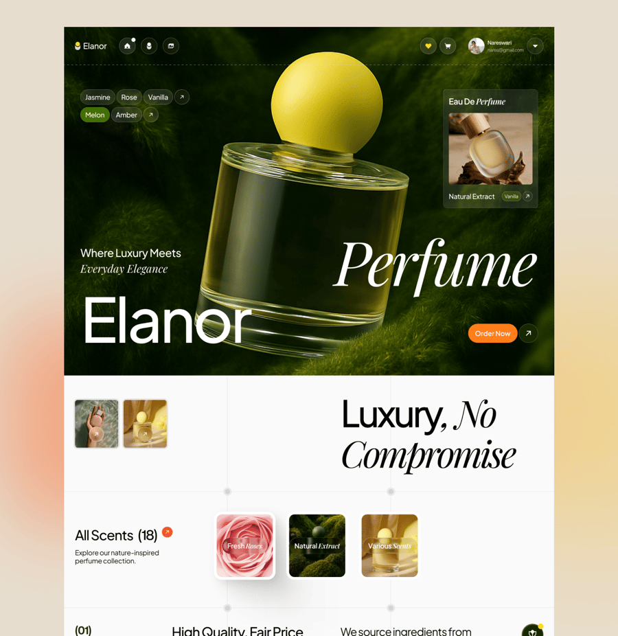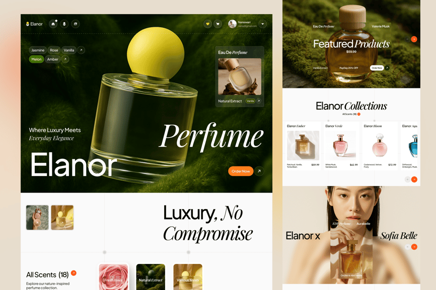 Elanor 是一款香水电商网站登陆页面 UI 套件。登陆页面包含 6 个部分,分别是:主打产品区、奢华产品区、不妥协产品区、特色产品区、Elanor 系列产品区、Elanor Sofia Belle 产品区和页脚。