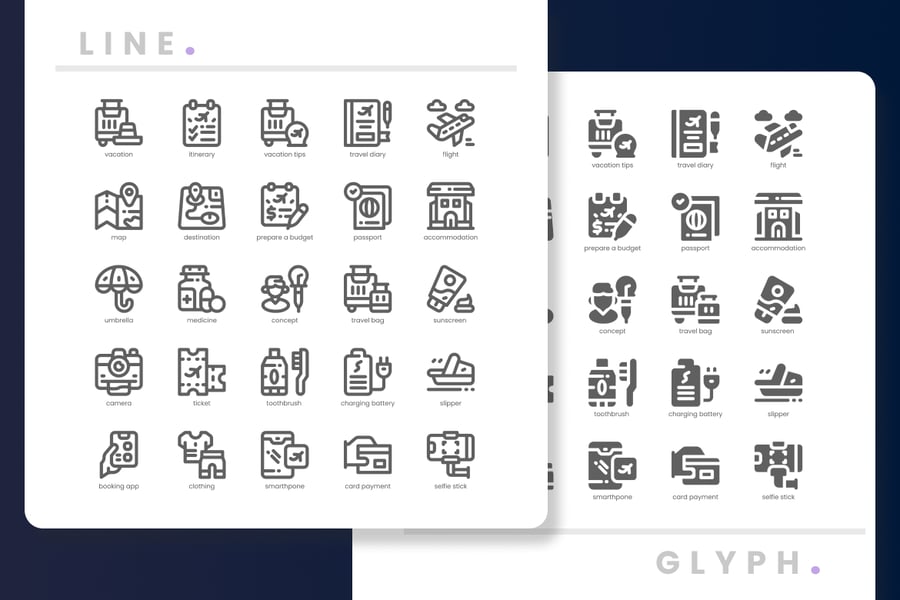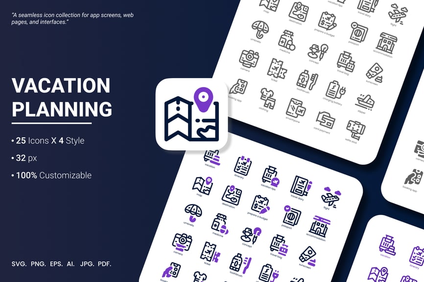 **假期计划图标包** 包含 100 个时尚图标,展现热门服务和创意。非常适合网站设计、移动应用程序、演示文稿、分析报告、信息图表和模板。
