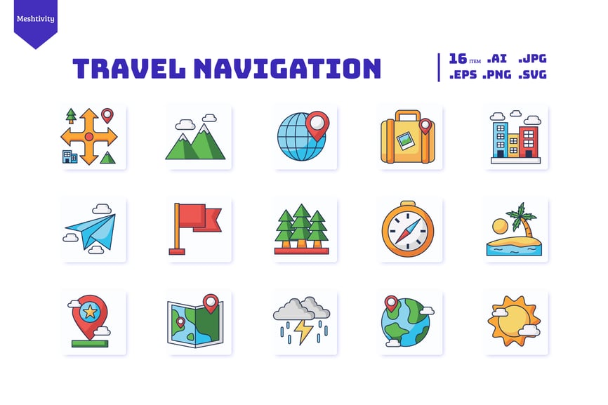 旅行导航扁平化图标集。高质量矢量图,满足您的设计需求。完美适用于项目设计、印刷模板、演示文稿设计、社交媒体、创意项目、贴纸设计等。