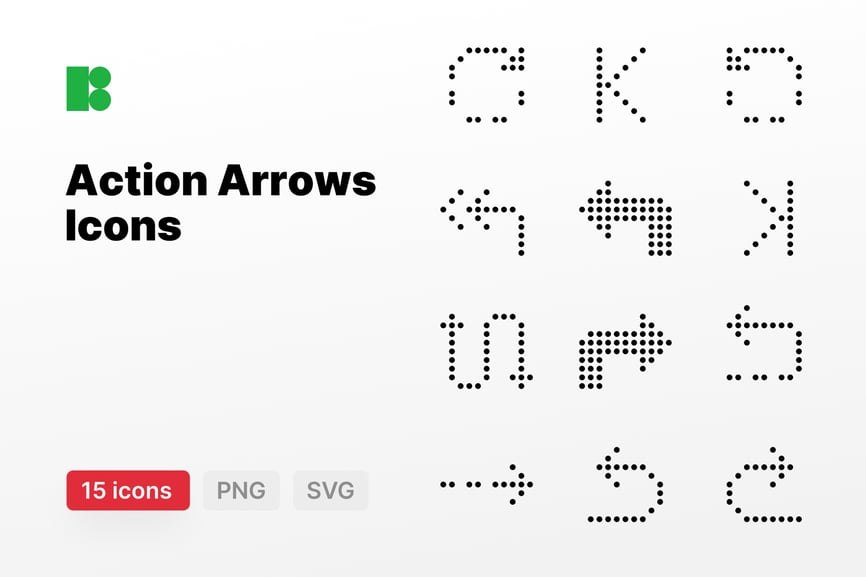 动作箭头图标集 — 15+ 个图标,矢量 SVG 格式和透明 PNG 格式。
