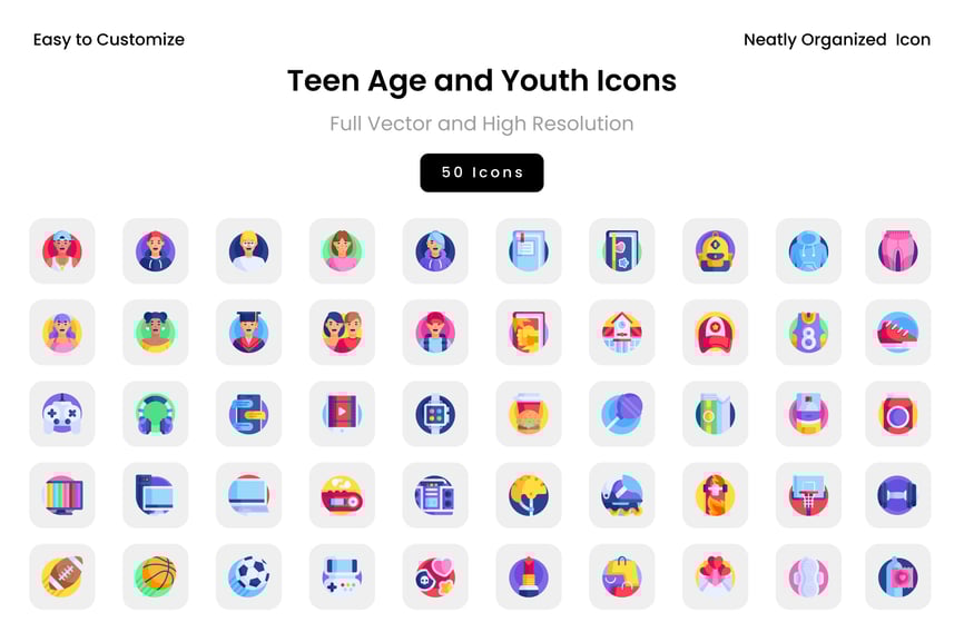 **50个青少年及青年图标,可编辑描边**