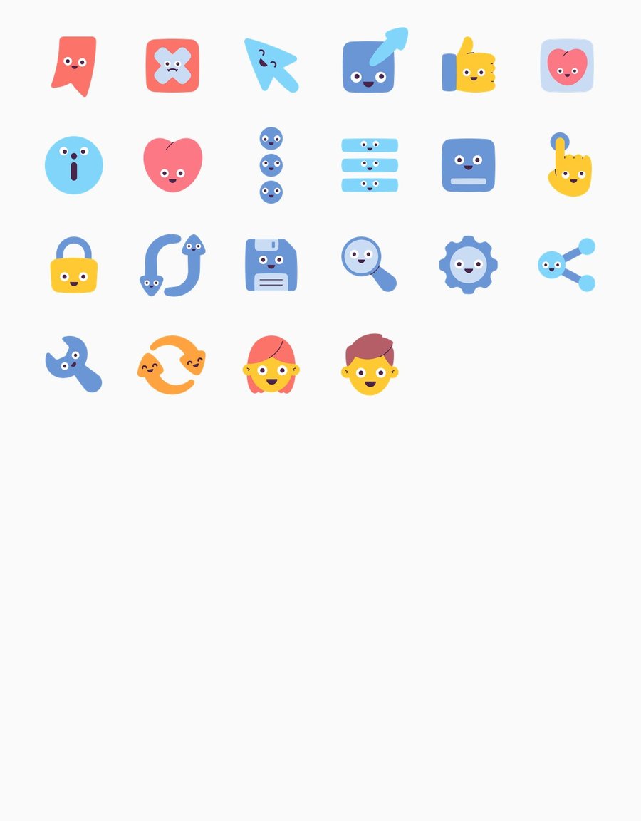 风格化的图标通过生动的眼神和丰富的表情,营造出一种亲切、温柔、和蔼的美感。这些图标以柔和的色调和圆润的线条勾勒出柔和的气质,可用于演示文稿、社交媒体,也非常适合制作精美的贴纸。