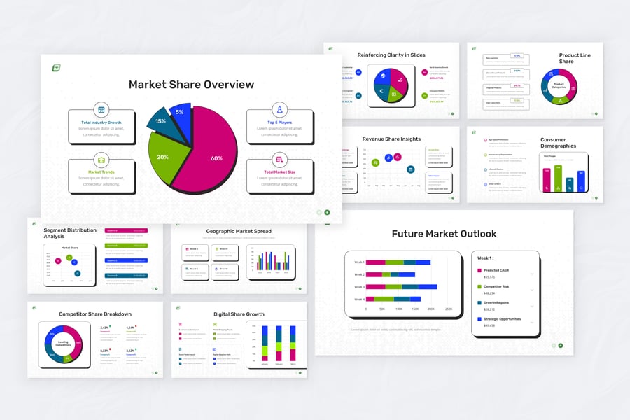 使用这款市场份额信息图表演示模板,清晰地展示您的竞争洞察,非常适合在战略会议上进行定位和分析。其醒目的布局有助于突出关键指标,并使复杂的数据易于理解。