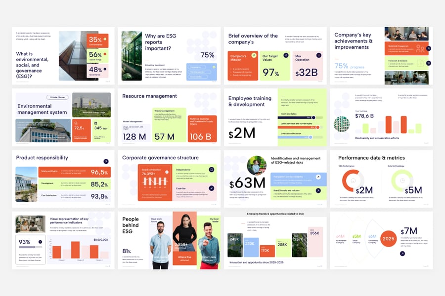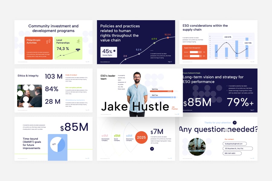 是一款现代风格的演示模板,非常适合用于企业可持续发展、环境、社会和治理报告、规划、商业演示、产品目录幻灯片、项目推介等多种用途。