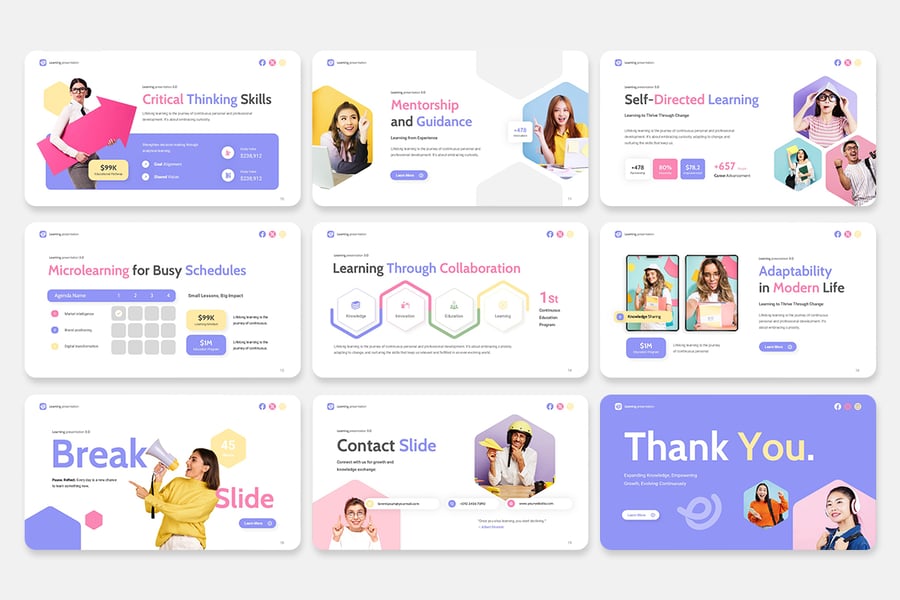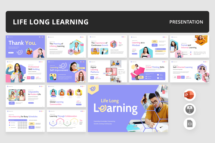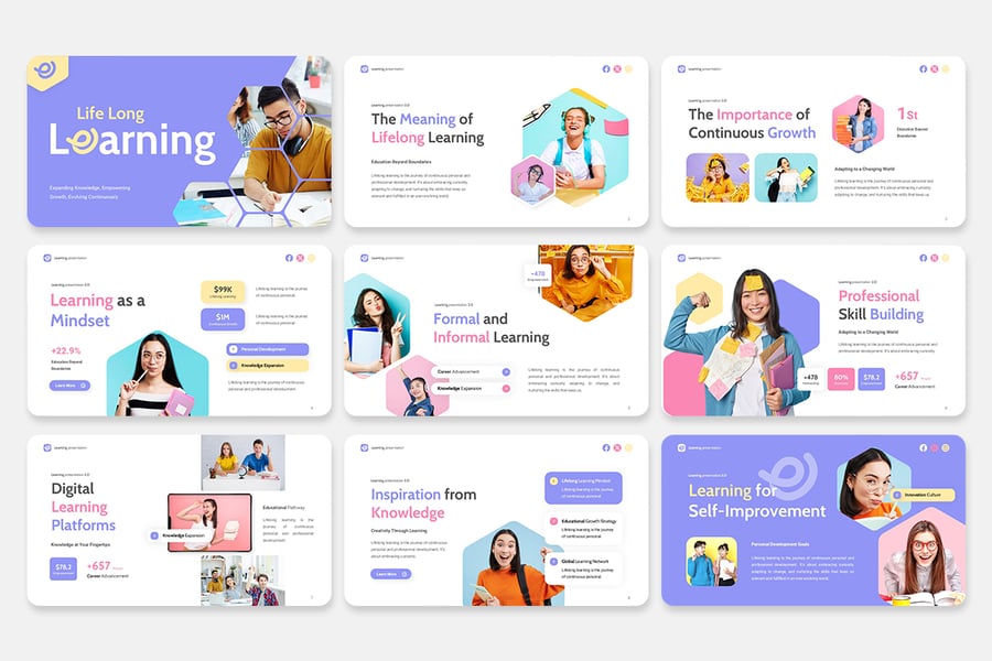 该模板非常适合教师、讲师、培训师、课程创建者、学术顾问和教育机构,他们正在寻找专业且具有视觉吸引力的演示工具包。