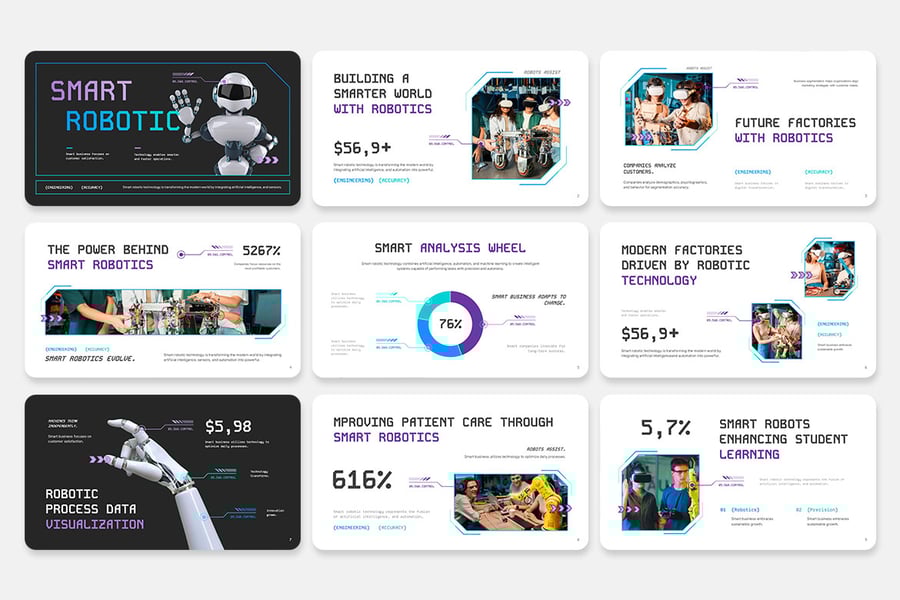 **智能机器人演示 – 技术类 PowerPoint 模板** 使用智能机器人模板提升您的演示效果。这款多功能、创意十足且设计简洁的 PowerPoint 模板,专为企业和个人用途而设计。它融合了现代美学与专业气质,是任何希望给客户或利益相关者留下深刻印象的人士的理想之选。凭借其灵活的风格和简洁的设计,智能机器人模板能够提升您的演示质量,使其成为有效传达理念和提升客户参与度的必备工具。