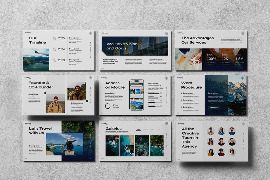 使用旅行社主题演讲模板,让您的旅行梦想成真。该模板采用色彩丰富的布局和引人注目的视觉效果,旨在以极具冲击力的方式展示目的地、旅行套餐和行程安排。重点突出基于应用程序的便捷预订和安全支付选项,让旅行计划轻松无忧。对于希望以创意、清晰和现代的方式展示服务的旅行社、旅游运营商和初创公司而言,这款模板堪称完美之选。