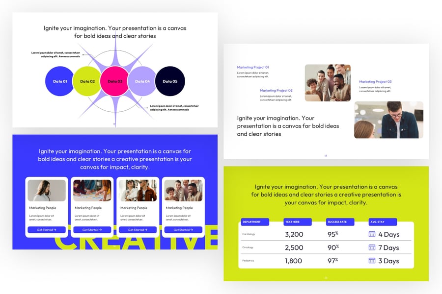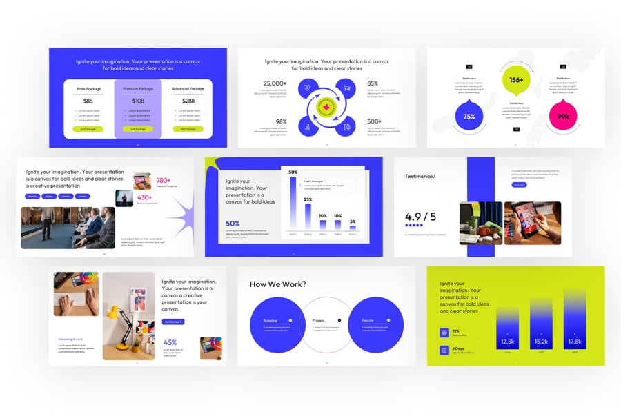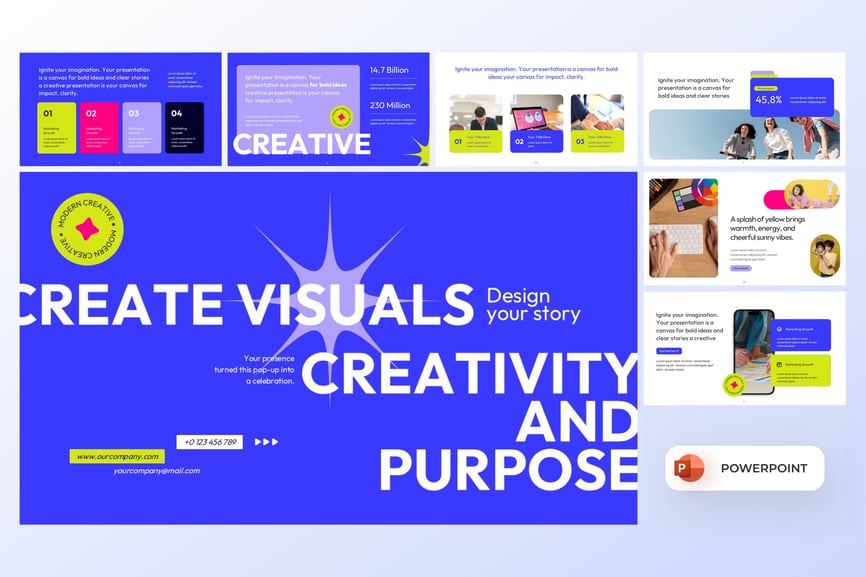 这款创意视觉效果 PowerPoint 模板是一款充满活力、色彩丰富的演示文稿设计,专为故事讲述者、设计师和营销人员量身打造。其醒目的蓝黄配色瞬间吸引眼球,是展示创新理念、创意项目和营销策略的理想之选。每张幻灯片都巧妙地将鲜艳的视觉效果与简洁的字体相结合,清晰有力地传达信息。该模板提供灵活的布局,可用于展示作品集、数据要点和品牌故事,将您的信息转化为极具视觉冲击力的演示体验,是代理机构和创意专业人士的理想之选。