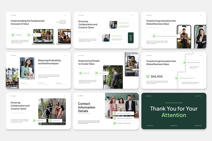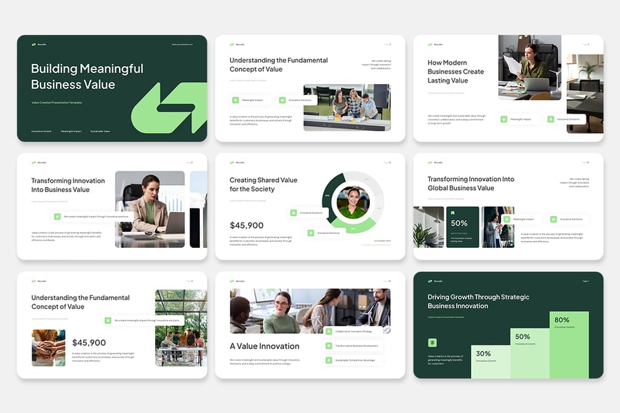 **价值创造商业计划演示模板** 是一个全面且精心设计的幻灯片框架,旨在帮助企业家、初创公司、顾问和企业战略家以最大的影响力阐明价值创造、商业战略、增长机会和投资者前景。